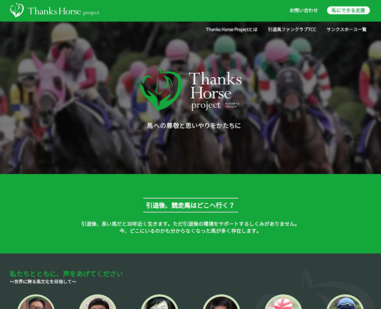 引退馬への支援を行うサービス「サンクスホースプロジェクト」のロゴマーク、ウェブサイトデザインを行いました。これまで日本では無かった引退馬支援の形をサービスにしたこのプロジェクトは公開1週間で10,000PVを超える人気で、業界でも話題となりました。今までに無かったサービス内容を伝えるために、説明しなければいけない事が多く5,000pxを超える長いページが2ページできました。ひと目で伝えるために意図的にグラフィックを多用したデザインにしています。
