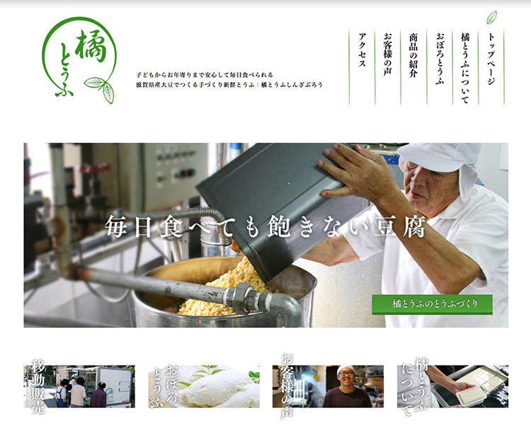 ウェブサイト立上げ、名刺リニューアル製作を行いました。滋賀県で最も人気のあるとうふの移動販売も行うとうふ屋、橘とうふしんざぶろう。手作りしている商品、こだわりの製作方法、お客様の声など今まで公開していなかったものを順次公開し、滋賀県のとうふとして検索結果No.1となり、認知拡大につながりました