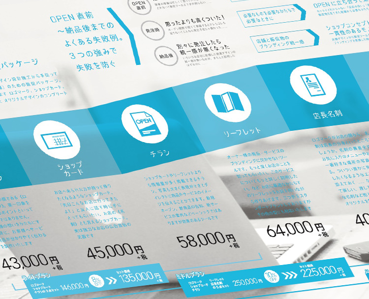 ロゴマーク、ショップカード、チラシ、名刺、リーフレット、ウェブサイトをトータルデザインで作れる開業販促パッケージサービス「STORE TOOL」。新しく始まるサービスの立上げ支援を行いました。京都の店舗デザイン設計・施工の会社“コトスタイル”の新サービスで、個人オーナー様向けの至れり尽くせりの販促パッケージサービスが誕生しました